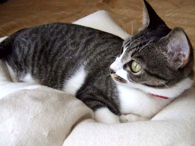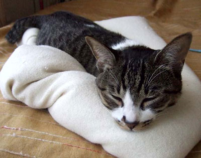 ベッドでも白クッション2007年5月22日カメラに写ってる白クッション(枕ではない)のあまりで作ったクッションは、ベッドに持っていってあります。 ベッドの上で遊ぶ時は隠れ場所に、夜寝る時は寝床にと大活躍しています。 土日飼い主がほぼ寝てばかりの間、なつめさんはこの上で寝てました。 「なんか動いた」 鳥が居たようです。 「ぷにゅー」 猫型ツチノコ。 Posted by jey